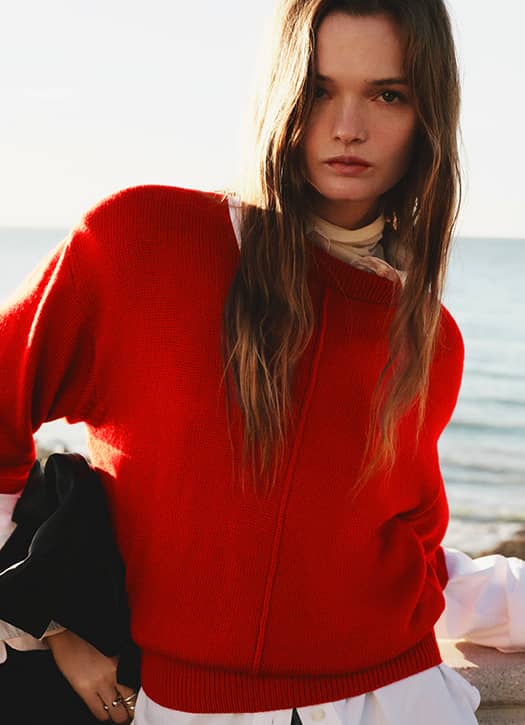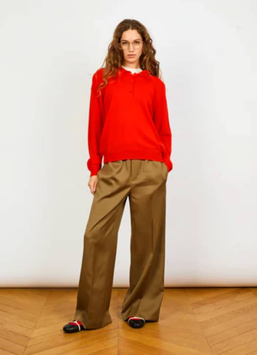 Le rouge s’impose sans hésitation comme la couleur phare de la saison. Aperçu chez Valentino, Fendi ou encore Alaïa, il traverse les maisons avec assurance. Chez Alexandra Golovanoff, il prend la forme d’un pull en cachemire à l’allure presque couture. Son col polo et sa teinte poppy lui donnent ce petit twist vintage qu’on aime particulièrement. Une pièce facile à glisser dans le quotidien, qui éclaire immédiatement la silhouette.