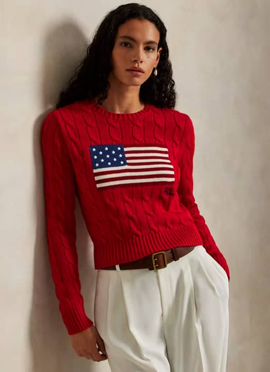 Impossible de parler pulls sans évoquer Ralph Lauren. Cette saison, la maison revisite l’un de ses classiques : le pull court à torsades, en coton, dans un rouge pop rehaussé du drapeau iconique. Une pièce reconnaissable entre toutes, qui apporte immédiatement du caractère à une silhouette. Le genre de pull qu’on enfile et qui fait toujours son effet.
