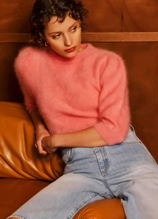 Pour nos girls qui ne se lassent jamais du rose, cette teinte finit toujours par trouver sa place dans la garde-robe. Chez Petite Mendigote, le pull prend une allure plus coquette. En cachemire brossé, à la manche mi-longue, il dévoile surtout un dos-nu qui donne déjà envie de printemps. On l’imagine avec un bermuda en jean clair et une paire de lunettes posée sur le bout du nez. Vous avez dit effortless ?