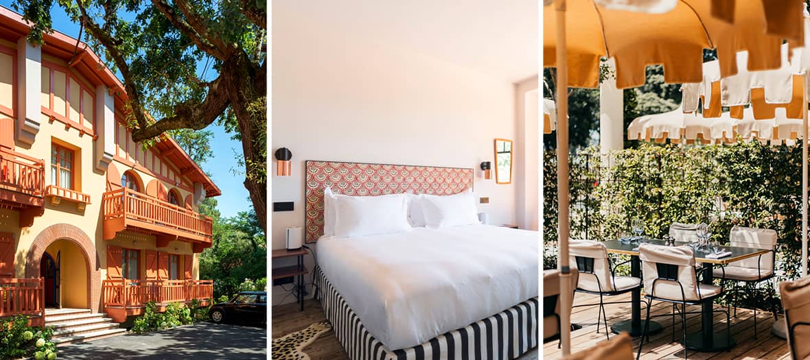 À deux pas de la plage du Pyla, cet établissement mythique depuis 1932, qui connut ses heures de gloire entre la fin des années 40 et les années 70, s’était un rien assoupi… Rouvert en 2017 après un an de travaux menés par les architectes Philippe Ducos et Alexandre Rougier épaulés par Bambi Sloan, et le voilà doté de 4 étoiles et d’une déco pétillante mixant couleurs acidulées, tissus et meubles vintage. Derrière la façade d’origine de style basque couleur safran, on découvre un monde plein de fantaisie : sirènes, étoiles de mer et hippocampes s’ébattent sur la mosaïque du bar, poissons rouges et homards barbotent sur les globes lumineux des couloirs. Au salon le mélange des genres atteint des sommets : tables en formica, moquette léopard et des affiches de spectacles de Claude François, Pierre Perret, Jimi Hendrix, Enrico Macias ponctuant les murs. Dans les 24 chambres et suites réparties entre la maison et les 6 cabanes de style ostréicole, la déco affiche un look sixties : teintes acidulées, descente de lit léopard, meubles et téléphones vintage, mosaïque jaune et noire dans les salles de bain. Au restaurant prolongé d’une terrasse, on savoure une cuisine de saison qui s’inspire de l’Italie.