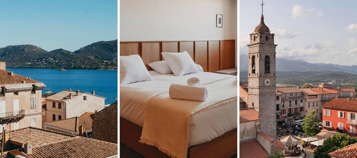 Nul besoin d’être titulaire d’une carte platinium pour s’offrir quelques jours à Porto Vecchio… Plus ancien hôtel de la ville, l’hôtel Moderne est le seul à être installé au cœur des remparts génois, en face de l’église Saint Jean-Baptiste. Ce boutique hôtel 4 étoiles est dans la même famille depuis 1988 et ce sont les 3 sœurs Tubiana, Anais, Chloé et Marie-Léa, qui le dirigent aujourd’hui : une histoire comme on les aime. Après 4 ans de travaux, l’hôtel a rouvert en 2023. L’extérieur du bâtiment qui date du XIXè siècle en pierre, symbole d’authenticité corse, a été soigneusement conservé et l’intérieur entièrement revu abrite 15 chambres dont une suite. La déco ne renie pas un certain minimalisme japonisant mettant en avant matériaux bruts, mobilier en chêne, éclairage chaud… Pas de restaurant ici, mais un bar où le petit déjeuner propose des produits frais issus d’artisans locaux, et un room service. Bon à savoir : les chambres supérieures et la suite accueillent jusqu’à 3 personnes et si vous voyagez avec un bébé, lit, chaise haute, baignoire, sont à votre disposition. Sans oublier livres, jeux de société etc. pour les plus grands.
