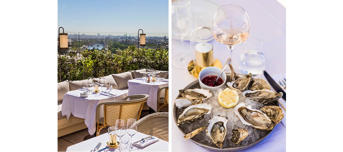 On finit en beauté sur des chouquettes à la crème de citron, une pavlova ou une coupe de fruits à partager en trinquant avec la Tour Eiffel, le Panthéon et Montmartre. Cheers !