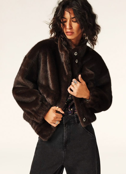 Au placard le bomber classique avec cette étonnante veste bimatière Claudie Pierlot. On mixe les styles avec un patchwork vintage sur le buste et des manches en fausse fourrure. Le plus ? Son col chemise permet de la porter fermée avec une bride en cuir pour un max de confort.