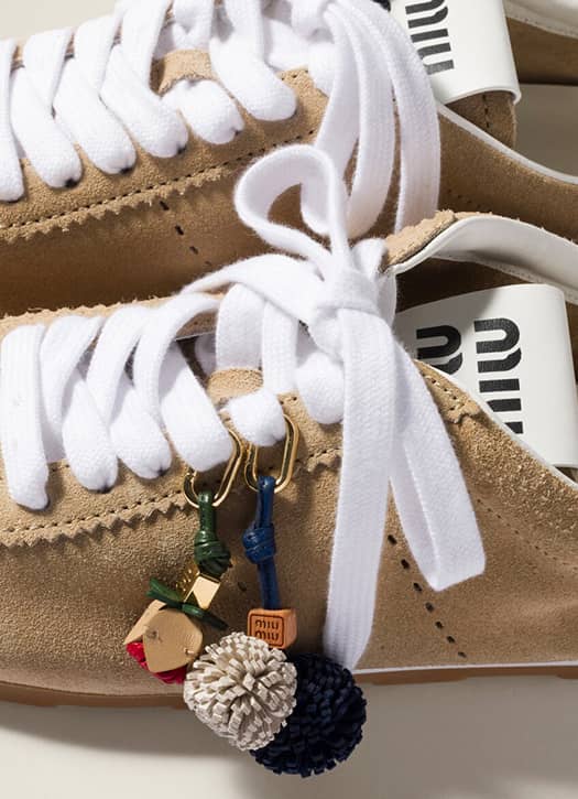 Miu Miu, la petite sœur effrontée de Prada, continue de dicter les tendances. Et puisque les baskets squattent le devant de la scène, la maison pousse l’idée encore plus loin avec des charms en micro pompons de cuir à clipser sur les lacets, pour transformer une paire toute simple en signature personnelle. C’est ludique, mode, et surtout, ça donne l’impression d’avoir des baskets uniques.