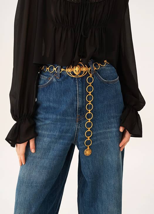 Si, à l’origine, la ceinture servait simplement à tenir un pantalon, aujourd’hui elle dessine la silhouette, structure une robe trop simple, donne du relief à une jupe et rehausse un pantalon tailleur. Chez Chloé, on a craqué pour la ceinture Amulet en laiton doré effet vintage : de jolis maillons ronds, une boucle ornementale, et surtout la possibilité de l’ajuster comme on veut. On l’imagine parfaitement avec un pantalon noir bien coupé, une blouse légère et de gros bijoux dorés pour un look assuré.