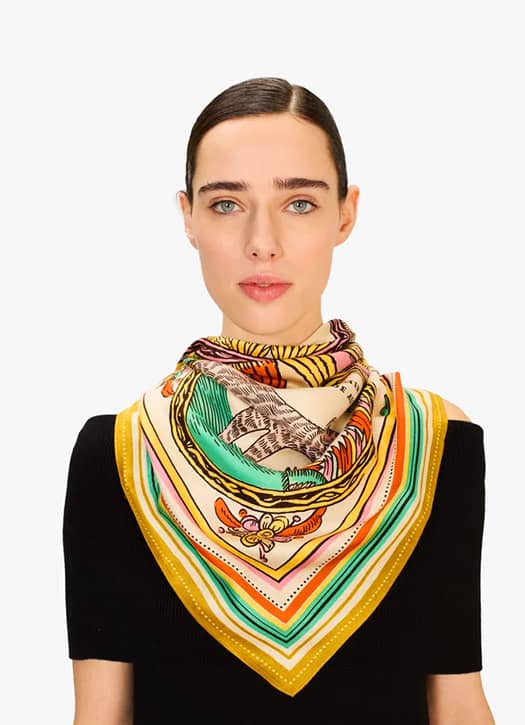 Si vous vous promenez un peu dans le Marais, vous l’avez forcément remarqué : le foulard est partout : façon bandeau dans les cheveux, noué autour du cou, porté en top improvisé ou même autour de la tête façon Insta-girl en terrasse. Chez Inoui, c’est devenu une véritable pièce signature, entre accessoire et œuvre textile. Ses imprimés racontent des histoires, réveillant immédiatement une tenue un peu trop sage.