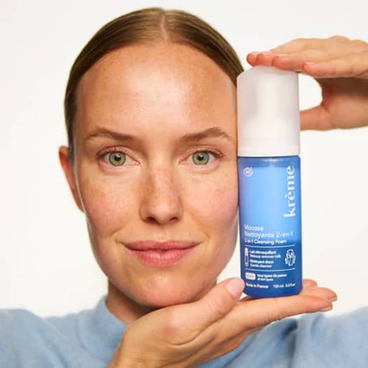 On est obsédé par la formule mousse et Krème a trouvé la solution miracle pour nos soirs de flemme ! Ce génial 2-en-1 est parfait quand on rêve juste de se glisser sous la couette. En haut, un lait démaquillant aux probiotiques et amande douce bio pour apaiser. En bas, une mousse nettoyante et détoxifiante à la spiruline française. C'est la mousse express qui vous sauve, d’autant plus pour celles qui n’ont pas le courage de boire de la spiruline : autant l’appliquer sur son visage !