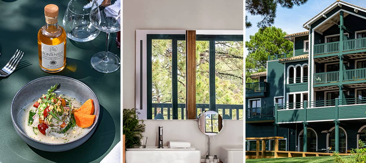 Bénéficiant d’une situation magique au cœur de la forêt de pins et de chênes lièges, dominant les 70 hectares du golf de Seignosse (d’où son nom !), avec l’Océan en toile de fond, ce 4 étoiles de la Collection les Domaines de Fontenille est bourré d’atouts ! Inauguré en juin 2021 après plus d’un an de travaux, il affiche une architecture de style basque avec sa façade de bois teintée de vert soulignée de menuiseries blanches. Au rez-de-chaussée, on trouve de vastes espaces à la décoration graphique, parés d’une déclinaison de verts, accueillant le restaurant et deux salons avec de larges terrasses bordant l’ensemble. Ces dernières se déploient autour de la belle piscine chauffée et permettent un coup d’œil sur le golf… Dans le salon-bibliothèque le côté « sport » de l’hôtel est souligné par des raquettes et clubs de golf anciens et un baby-foot trônant au milieu de la pièce !
