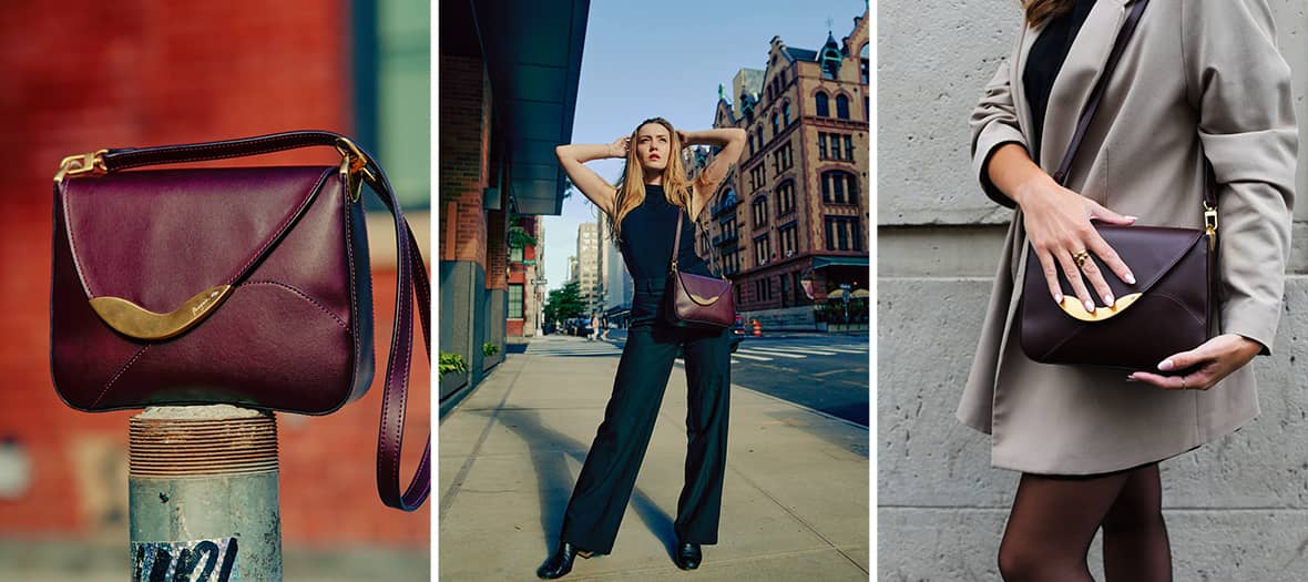 Nos coups de cœur : le sac Pomme en bordeaux, en noir et même bicolore noir et crème pour encore plus de chic (599 €), des petites beautés que l’on imagine déjà glisser sur nos blazers préférés.