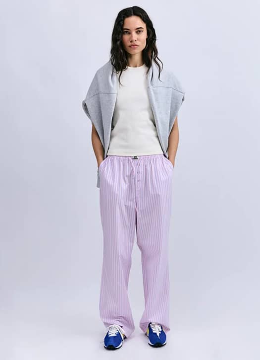 L’une des pièces les plus confortables du homewear, c’est évidemment le pantalon oversize en coton. Et celui de chez Love Stories est rose bonbon à rayures bleues et se porte avec un t-shirt un peu loose tout en gardant quand même une vraie allure. Résultat ? Même en descendant chercher la baguette le week-end, la boulangère se dira que vous avez le look, coco.