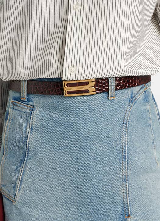 Les férues de mode savent repérer une ceinture signée Victoria Beckham. Fabriqué en Italie, ce modèle en cuir embossé aux reflets couleur café nous séduit pour marquer la taille sur une robe ou apporter du contraste et de la structure à un jean flare délavé. Un must !