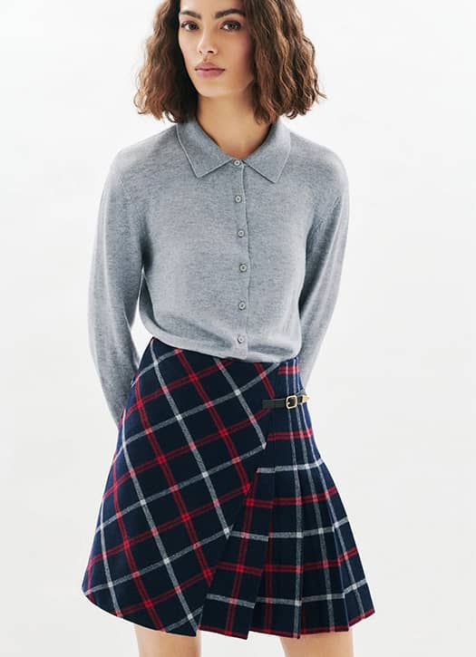 On en rêve autant que cela nous effraie : porter une jupe kilt relève du challenge. Pour éviter le côté mamie (coucou Elizabeth II), on l’associe à des collants et de belles bottes à talons, avec un sweatshirt pour casser le premier degré. Notre reco ? Cette jupette Margaret signée Caroll au tartan équilibré, dans des tons marine et rouge.