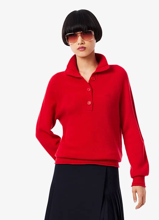 En hiver, le fond de teint et les pulls colorés sont nos meilleurs alliés pour pallier à la grise mine. Chez Lacoste, on craque pour ce lainage rouge vif à col montant, plus efficace qu’un rouge à lèvres pour attirer la lumière et les regards. Mention spéciale pour son petit croco ton sur ton : un détail dont on ne se lasse jamais.