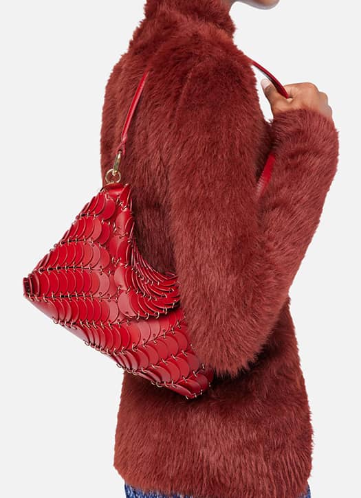 Les modeuses pointues s’arrachent les sacs Rabanne en métal pour frimer le soir. En version jour, on raffole de ce modèle Paco iconique dont la structure repose sur 230 disques en cuir rouge : une beauté à la fois stylée et pratique grâce à son rabat et sa taille tout-terrain. Trop beau, non ?