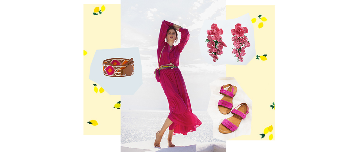 Quoi de plus seyant que la couleur fuchsia ? Maintenant que notre cerveau est habitué à vouloir l’imposer sur tous nos looks d’hiver comme d’été, on ose ce qu’on n’aurait jamais osé il y a un an : l’enfiler de la tête aux pieds. Vanessa Bruno rend le projet réalisable avec sa grande robe-chemise que l’on vient habiller d’une ceinture brodée, de sandales plates et de boucles d’oreilles dans le ton.