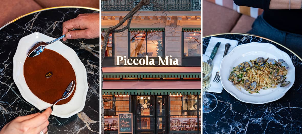En refilant le job au chef Denny Imbroisi (Ida, Epoca, Malro) qui a élaboré la carte, et en soignant son sourcing avec des produits de qualité qui arrivent tout droit de la Botte, cultivés chez des producteurs locaux, Piccola Mia assure sa réput’. Dans un florilège d’options, on retrouve à la carte les grands classiques italiens. Pour débuter le festin : la burrata servie avec de la betterave marinée en carpaccio (12,50 €), la stracciatella à la crème de truffe (16,50 €), le vitello tonnato à la piémontaise (12,50 €). Côté plats, la pasta se taille la part belle, des simples spaghettoni al pomodoro (12 €) aux belles linguine alle vongole (24 €) en passant par les lasagne alla bolognese (17 €). À ne pas louper, l’escalope de veau alla milanese bien faite, bien tendre (23 €). Et pour la touche sucrée, le choix est cornélien entre le tiramisu della nonna (10 €) et le baba au limoncello et sa chantilly à la vanille (9 €).
