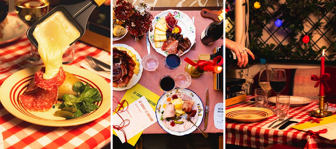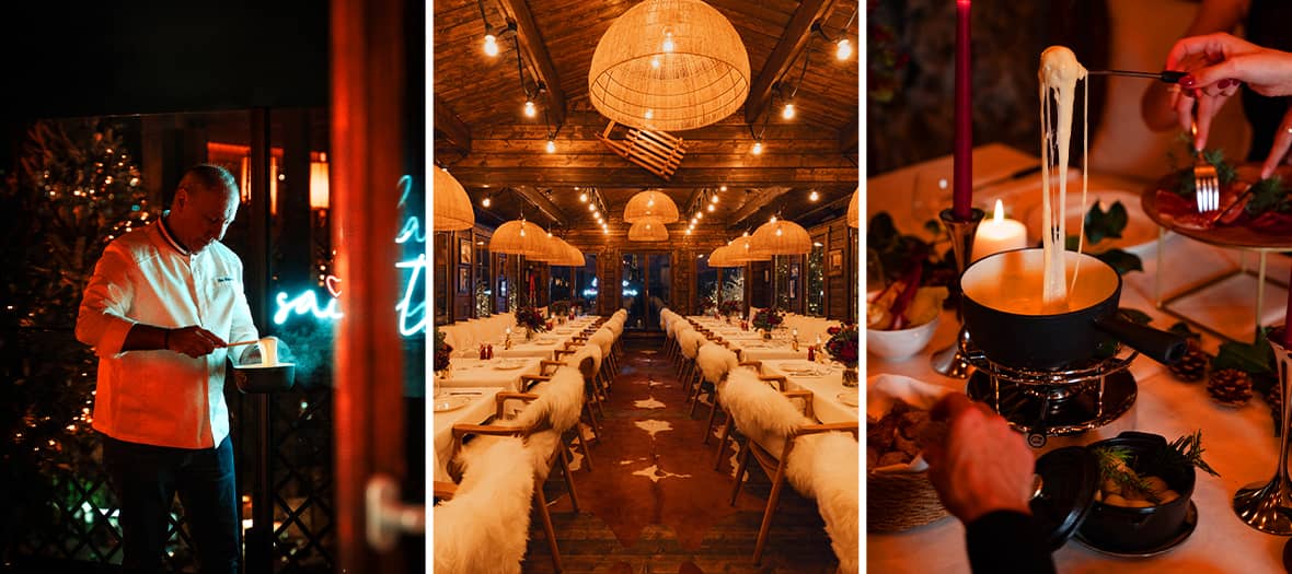 Au menu : un dîner pensé par le chef exécutif Jocelyn Herland et ses équipes (225 € par personne). On commence par un apéritif autour de marrons chauds dans leur sauce à l’oseille avec une coupe de champagne Veuve Clicquot La Grande Dame 2018. En entrée, il s’agira de faire un choix difficile entre les ravioles de foie gras au vin chaud, une flammekueche à la truffe et salade d’herbes ou les Saint-Jacques marinées aux agrumes et crème de chou-fleur. Le dîner est centré autour d’une sublime raclette au lait cru accompagnée d’une sélection de charcuteries, mesclun et pommes de terre fumées. Pour terminer sur une ligne totalement décadente, les chefs pâtissiers de l’hôtel Angelo Musa et Elisabeth Hot assument une diabolique fondue au chocolat, choux glacés et fruits exotiques dont on reprendrait volontiers tous les jours.