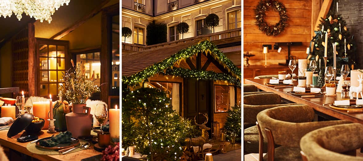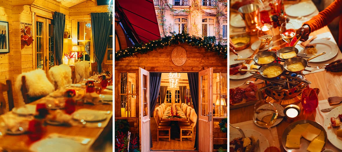 Pourquoi vous allez adorer ? Follement dépaysant et féerique, le chalet du Plaza Athénée, installé au cœur de la sublime Cour Jardin, fait face à une patinoire où les amateurs de glisse pourront tenter quelques figures avant le dîner (la patinoire est réservée pendant 1h aux personnes ayant réservé pour le chalet). À l’intérieur ? Une atmosphère mêlant confort et raffinement autour d’une grande table d’hôte pouvant accueillir jusqu’à 24 personnes. Mention spéciale pour les arts de la table signés par la manufacture française d’excellence Mauviel 1830.