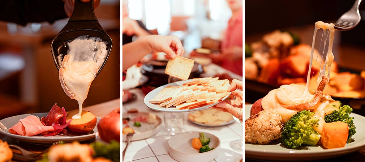 Au menu : un banquet d’exception imaginé par le chef Jean-François Rouquette dont on vous détaille les options du soir. En entrée, un saumon mariné au poivre rose, crème de livèche et suc de mandarine ou crème de lentilles aux truffes, suivis d’une vraie raclette montagnarde aux trois fromages Saint Niklaus (nature, fumé et ail des ours) accompagnée de pommes de terre grenailles, d’une jolie salade, de charcuteries à gogo et de parfaites saucisses fumées de la maison Baud. Mention spéciale pour le dessert tout frais et d’une délicatesse absolu, comme une salade de fruits avec clémentines, génoise à l’aloe vera et sorbet citronnelle à l’huile d’olive. Une douceur imaginée par la cheffe pâtissière Naraé Kim, auréolée du statut de Pâtissière de l’Année 2024 par Gault & Millau (rien que ça !). À noter également : un menu déjeuner à la carte avec, au choix, deux entrées et deux plats.