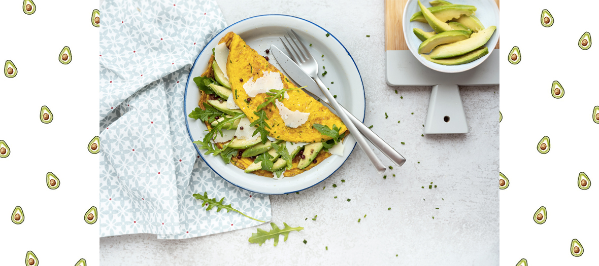 Farcir chaque omelette avec des tranches d'avocat, de roquette et de parmesan.