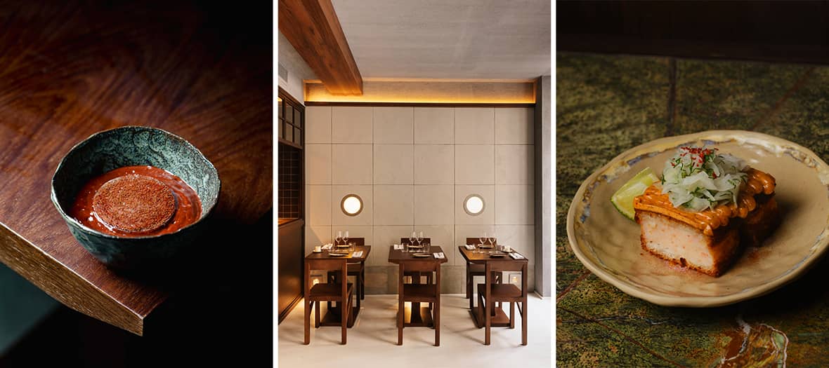 Une chaleur douce imprègne deux salles feutrées au décor minimaliste : tables en bois foncé, bar ultra moderne, jeux de matières métalliques, lumières basses à la bougie… On se croirait à New York dans ce lieu qui se vit plus qu’il ne se regarde. Le regard file au fond de la salle, où la cuisine ouverte capte toute l’attention : flammes vives et feu qui crépite annoncent un vrai spectacle. En cuisine, Esu Lee – fraîchement gratifié d’un Bib Gourmand pour son autre table Jip rue de la Roquette – développe une approche où feu, fermentation et contrastes règnent en maîtres, entre influences coréennes et produits européens.