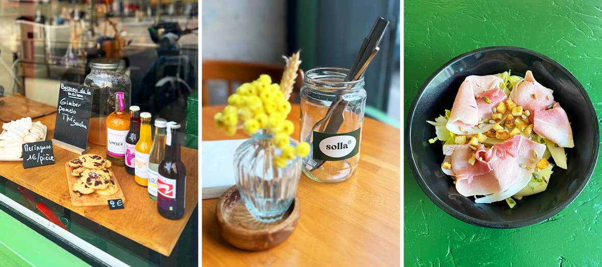 Le vrai plus du lieu ? La possibilité de se poser pour déguster sur place les produits qui nous ont fait de l'œil en rayon. Le midi, Solla propose une carte réduite qui change tous les jours (formules entre 9,80 et 14,80 €) avec un sandwich (6,50 €), une quiche (6,50 €), un plat chaud (8,80 €), ainsi qu'un panel de choix parmis de nombreuses sucreries et des boissons locales. L’aprem’, on y passe pour un goûter canon où les gâteaux de la cheffe (cakes, tartes, cookies…) s'agrémentent d’un café bio de la Brûlerie des Gobelins ou de l’une des boissons maison dont seule Béa à le secret.