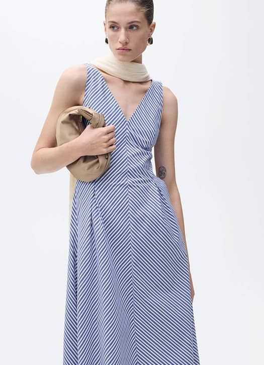 Summum du chic : cette robe midi à rayures bleues et blanches is giving gradins du Prix de Diane, et à prix mini ! On adore son col en V qui donne envie d’y glisser un joli collier ou une écharpe fine comme la mannequin sur la photo. À vos bibis et chapeaux !